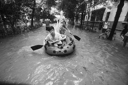 7月7日,湖北大學(xué)兩男生用充氣橡皮艇擺渡。