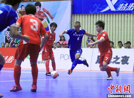 圖為中國大學生五人制足球聯賽總決賽場上雙方隊員激烈拼搶。中新社發 張暢 攝