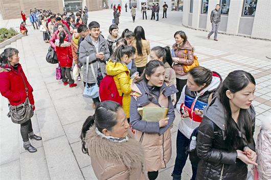前日上午,湖北大學逸夫人文樓門前排起了一條長隊,女生都略施粉黛、男生也精心打扮。而人文樓的另一側,百余名學生家長正站在門前靜靜等待。